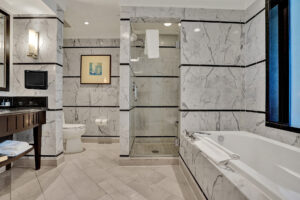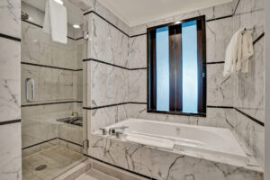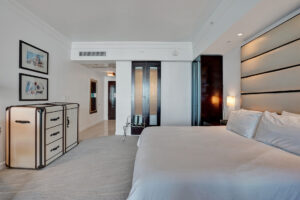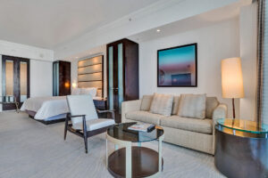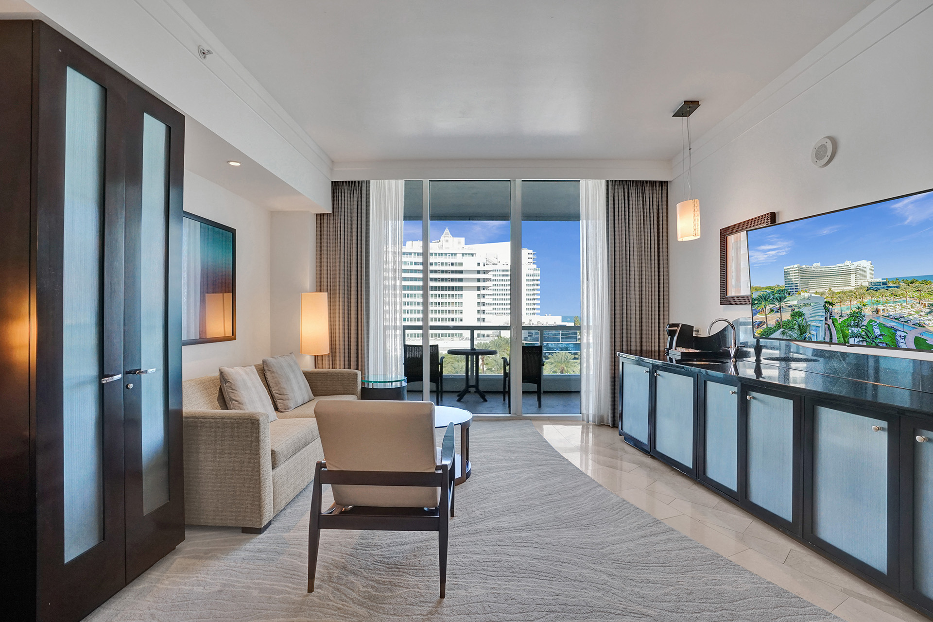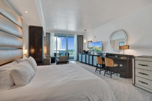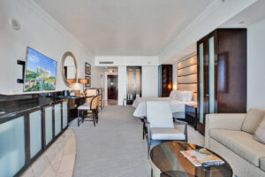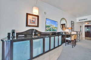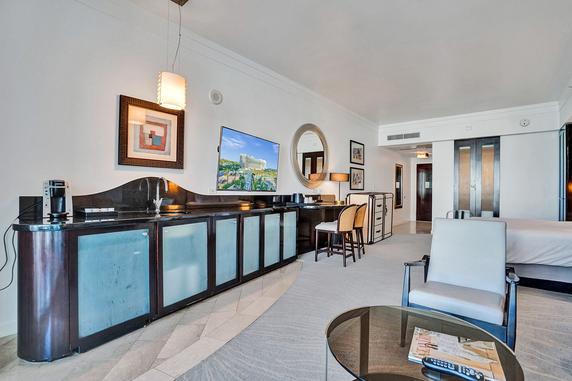 Renovated in 2019. The king sized bed is open to the sitting area in a studio set up. Sitting area features a Queen sized sofa pullout, desk, microwave, mini fridge, and Keruig. Enjoy views of the ocean and main pool from your balcony. Full marble bathroom. The junior suite unit is 575 sq. ft. Units.